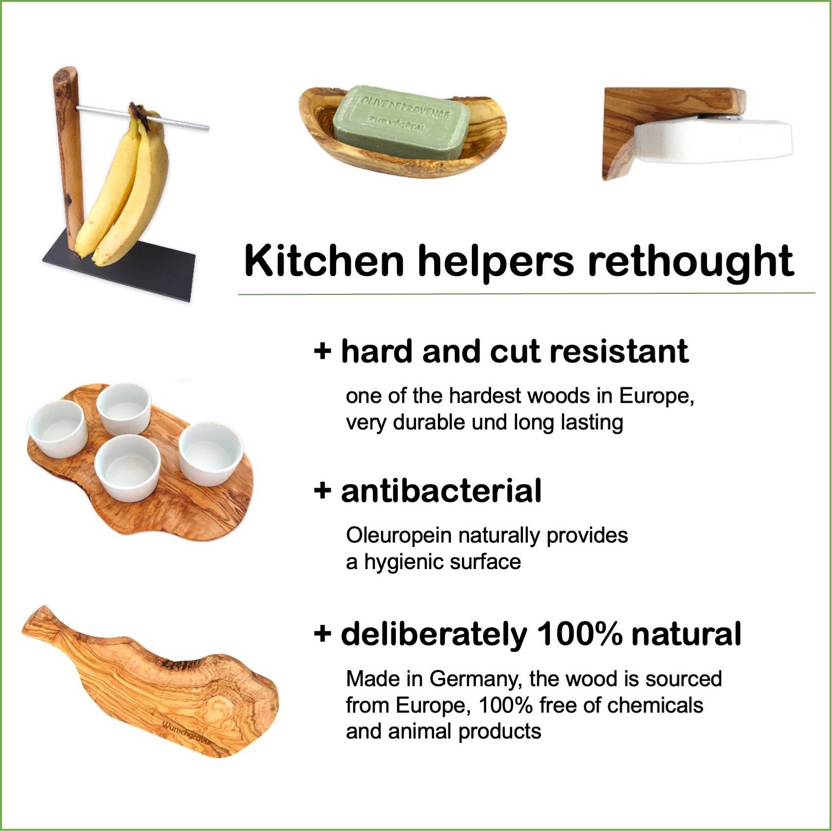 The jewelry stand features dual bars - one for chains and necklaces, and a rod for watches and bracelets. The vertical rod is crafted from stainless steel, with a base made of elegant olive wood and a contemporary porcelain bowl for earrings and other accessories.