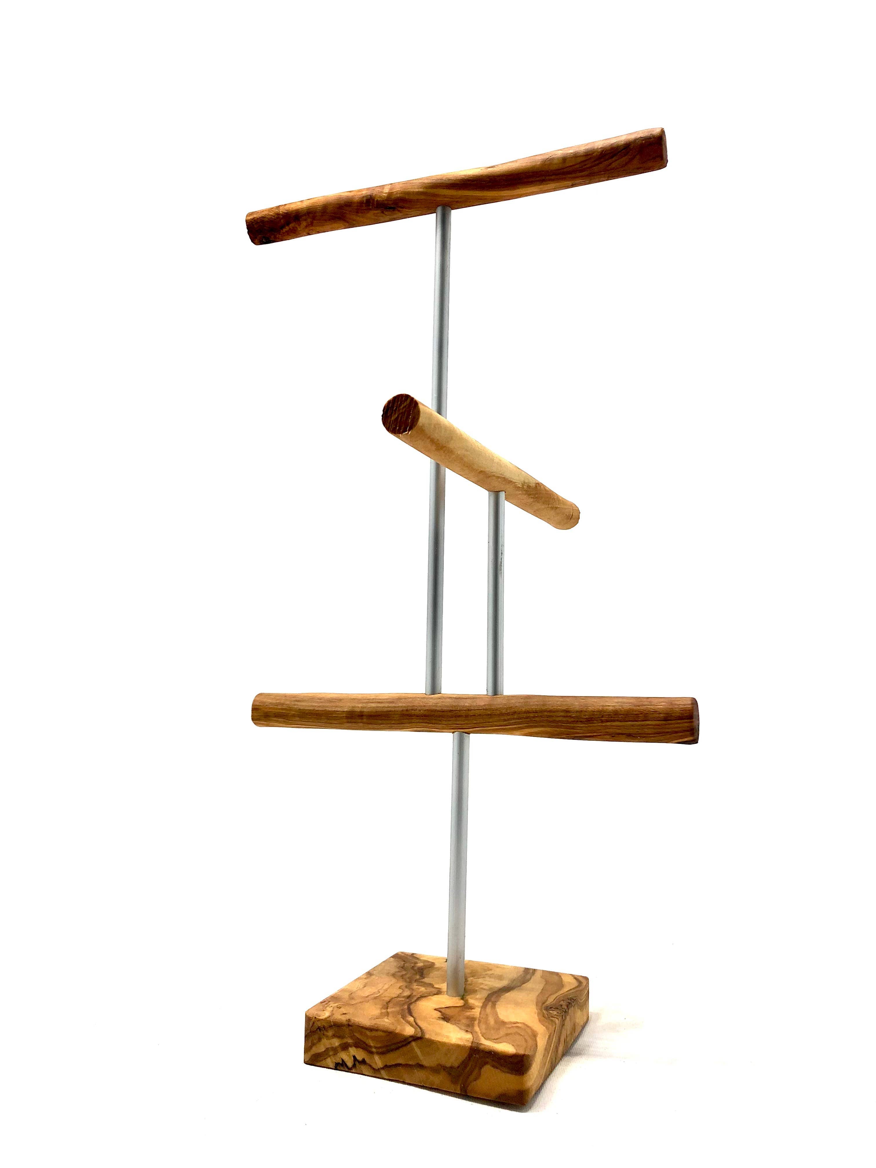 The jewelry stand has three swivel bars for bracelets, necklaces or rings. The vertical rod is made of stainless steel, the base is made of fine olive wood.