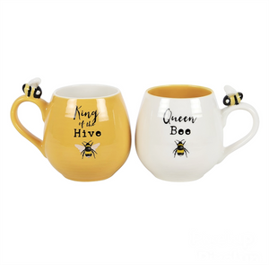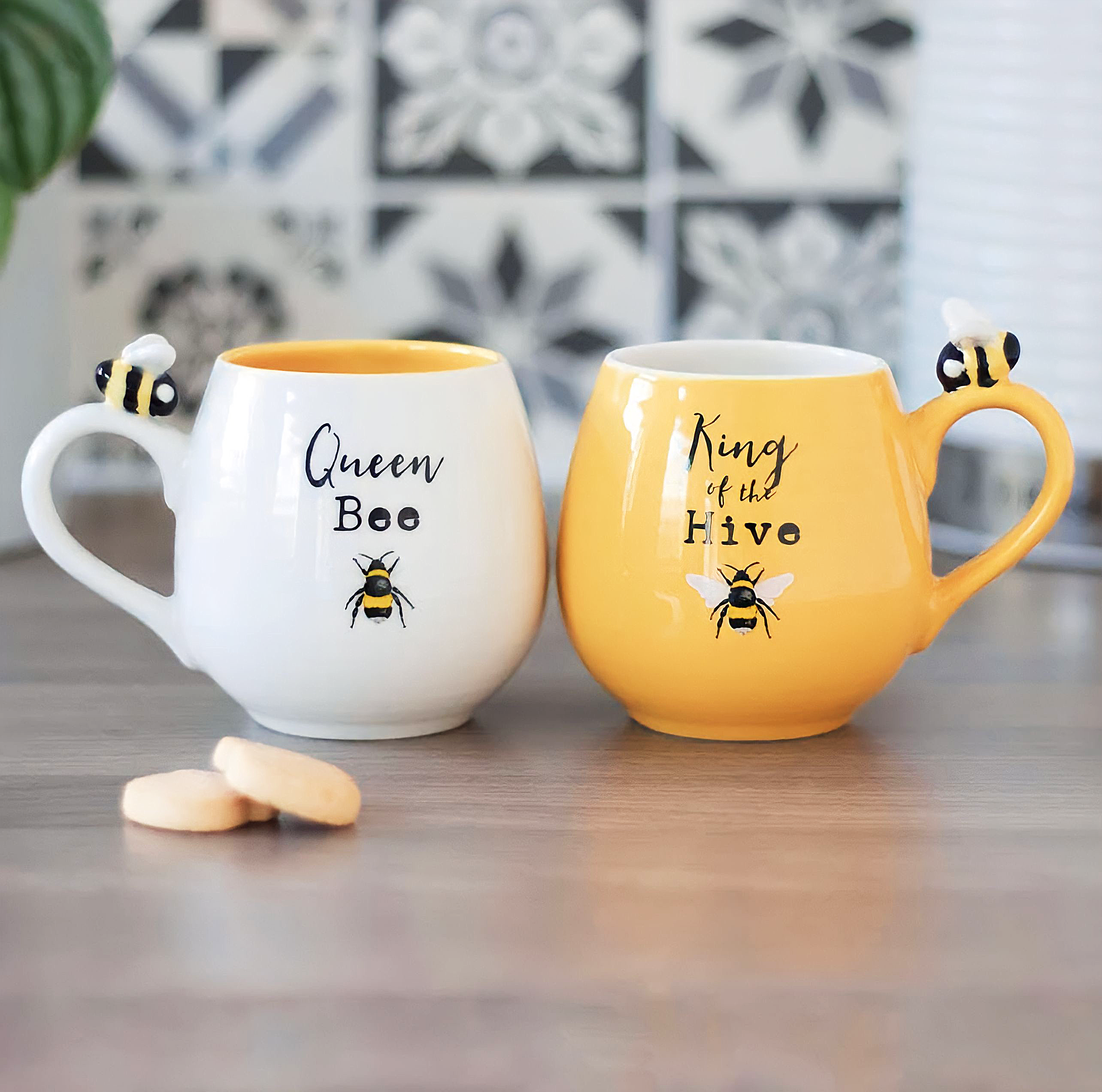 This cheerful pair of mugs is sure to start any day off with a smile. 'His' and 'Hers' designs feature 'King of the Hive' and 'Queen Bee' text accented by a 3D bee on the handle. Makes a sweet gift for couples of all kinds. 350ml capacity each. Dishwasher and microwave safe.Sold as a set of 2.