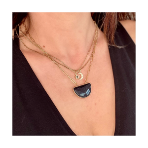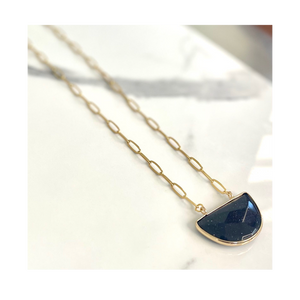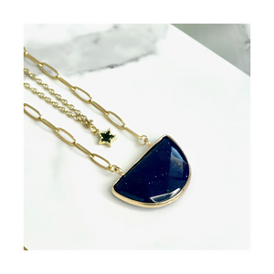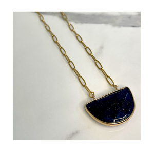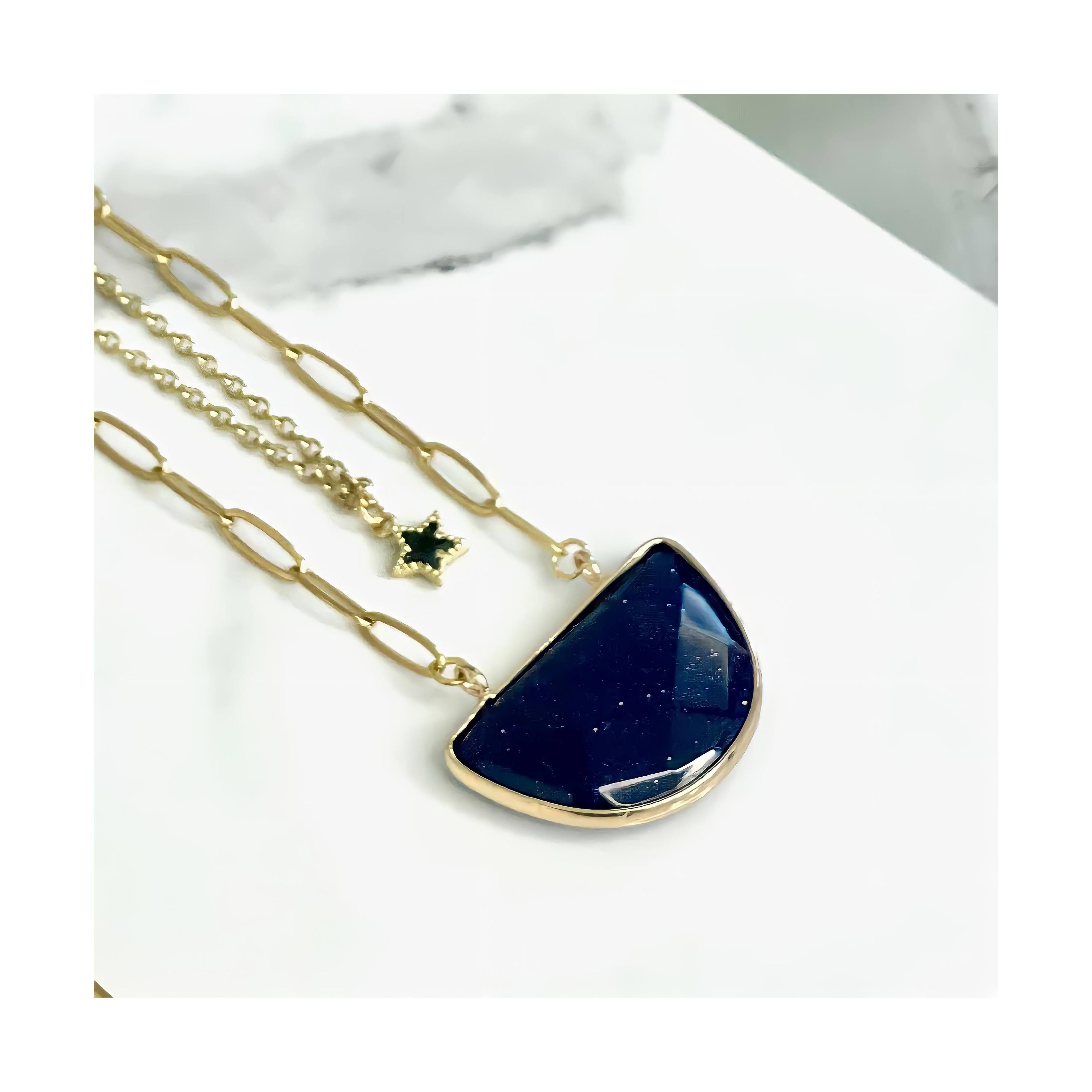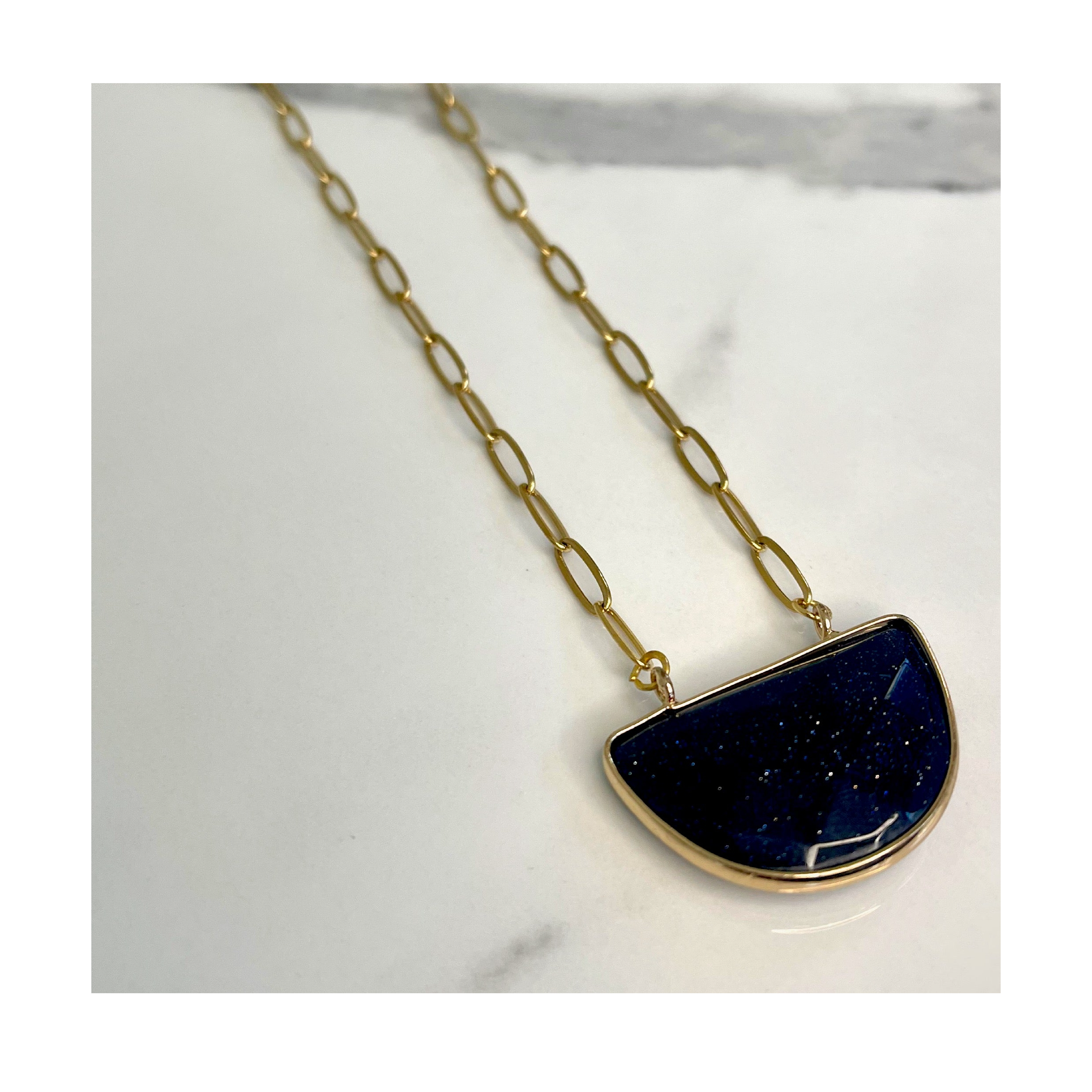 Blue Goldstone Semi Circle Pendant with a sparkle that resembles a mid-night sky.