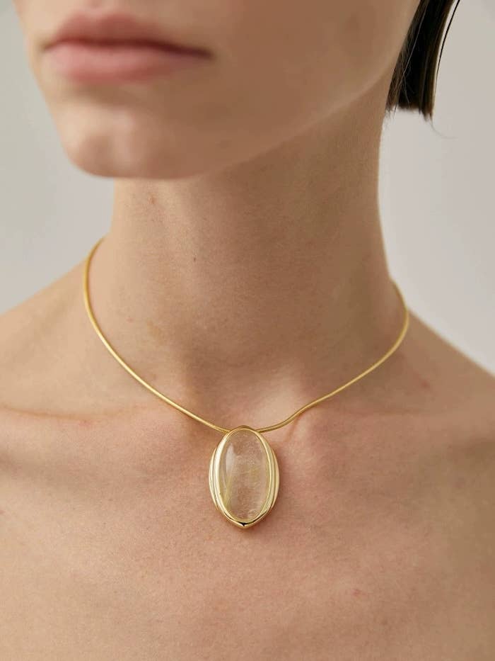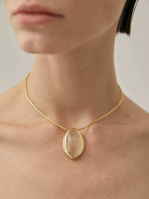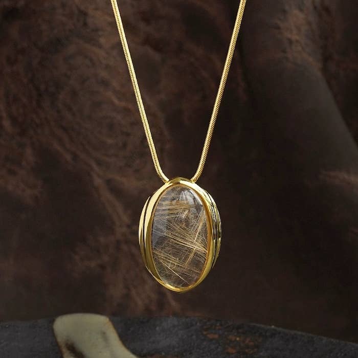 This genuine gemstone necklace features a stunning gold rutilated quartz oval pendant, making it a unique and eye-catching piece. The minimalist design highlights the natural beauty of the quartz, known for its strong healing powers.