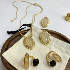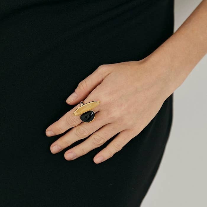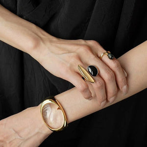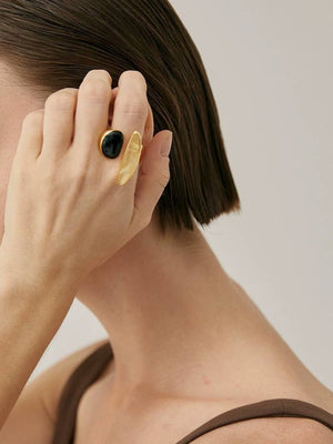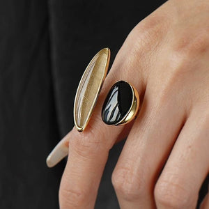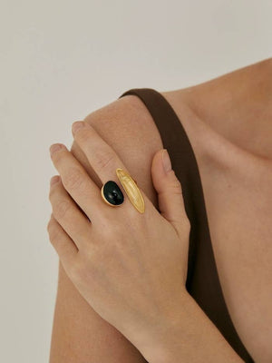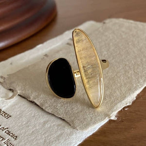 This eye-catching ring combines the elegance of geometric design with the beauty of genuine gemstones. Featuring a striking gold rutilated quartz and a deep black onyx, this ring offers a unique and sophisticated look. Crafted from brass with gold plating. This adjustable ring, preset to size 7, makes a perfect gift for him/her, symbolizing strength and healing power. Its bold yet minimalist design is ideal for any occasion, whether it's a meaningful gift or a stylish addition to your jewelry collection. Embrace the unique charm of this genuine gemstone ring and enjoy its timeless appeal.