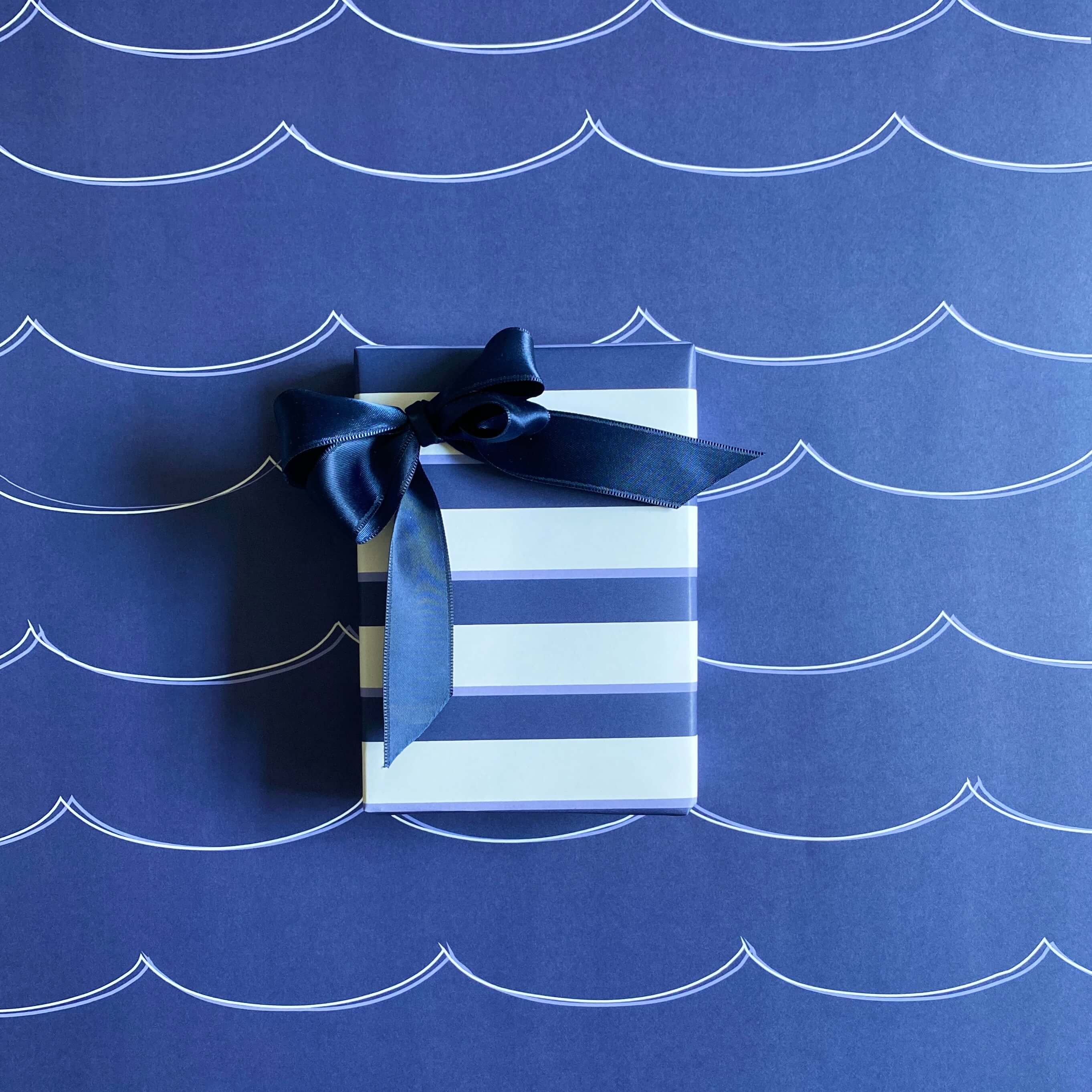 This design captures the the deep blue and gentle waves of the bay, with a nautical strip on the opposite side. This luxury double-sided wrapping paper features white and periwinkle waves on a navy background. The opposite side features navy and periwinkle stripes on a white background.