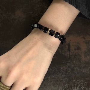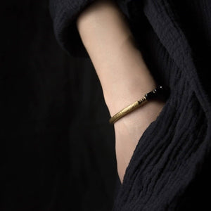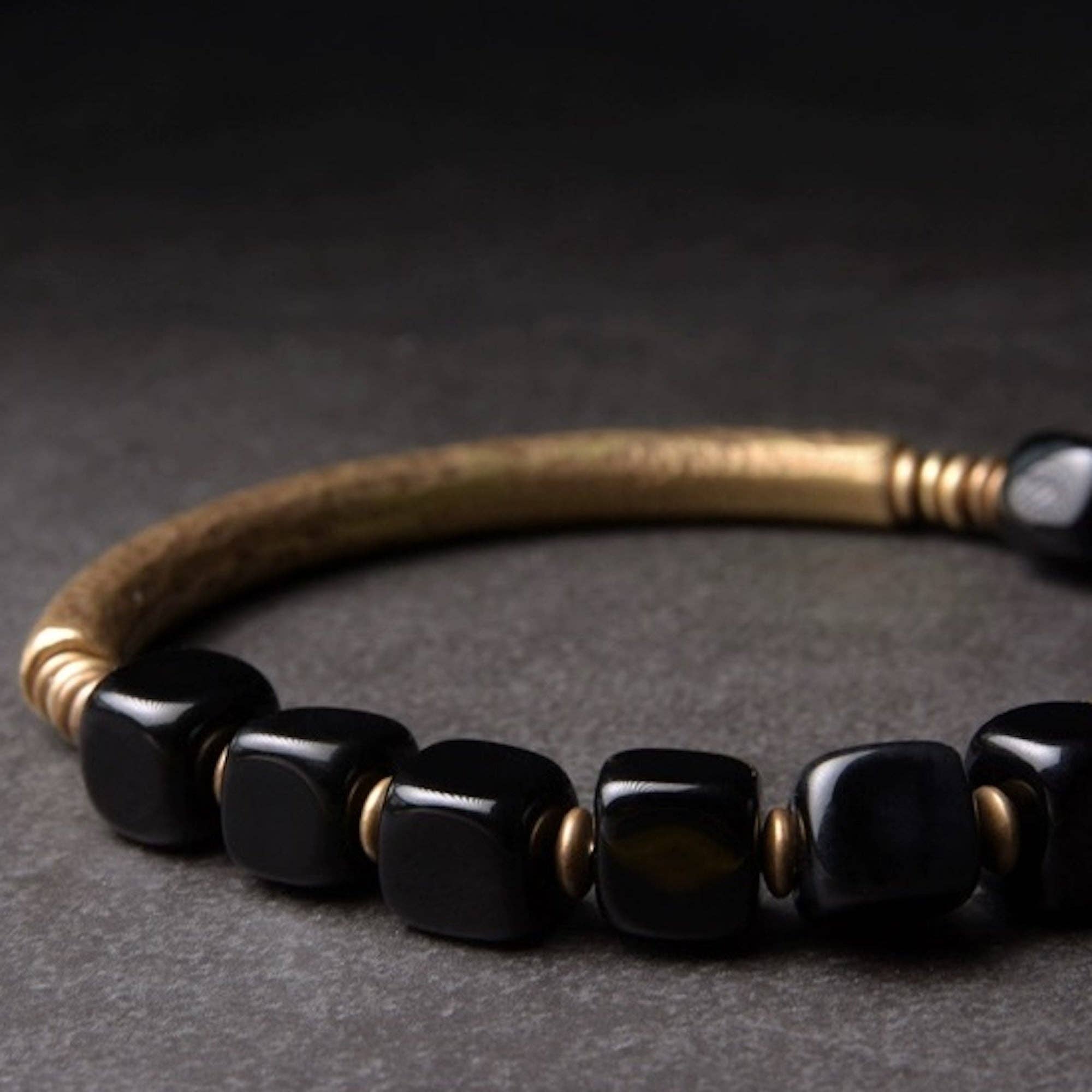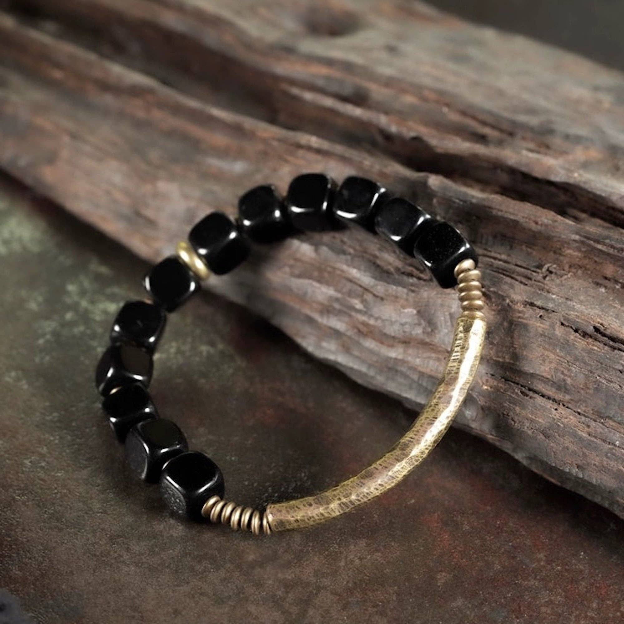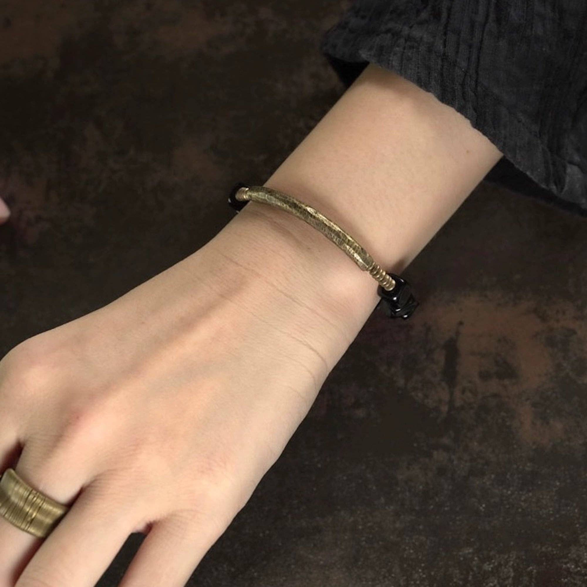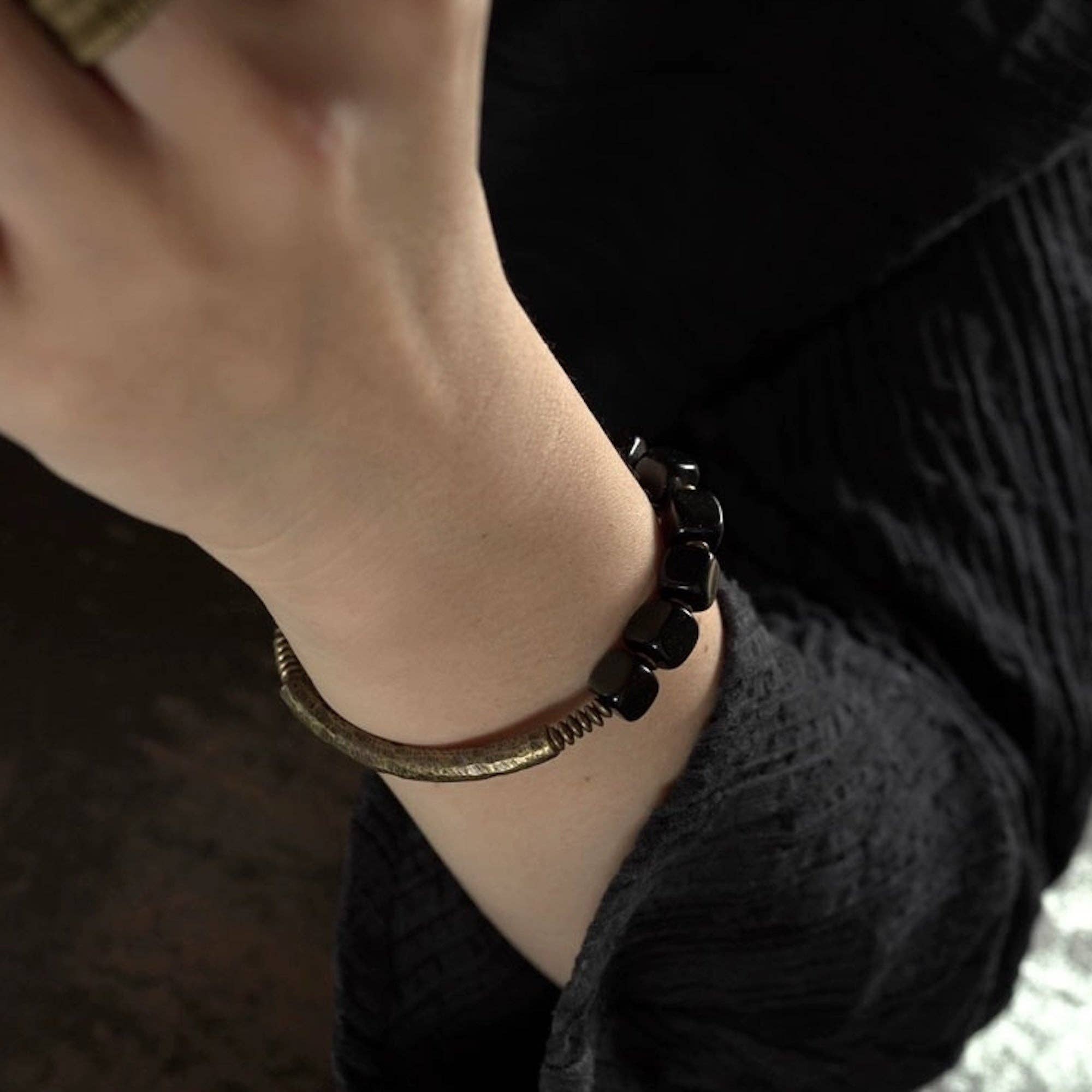 This unique bracelet boasts a chunky and bold aesthetic, with one half crafted from meticulously carved black obsidian blocks. Known for its healing energies, obsidian adds more than just style to this accessory—it brings positive vibes to your everyday wear. The obsidian blocks feature a vintage texture, enhancing the bracelet's overall appeal. Complementing the obsidian is the other half of the bracelet, made of an intricately designed bronze bangle. Measuring a total length of 18cm, this bracelet strikes a harmonious balance between statement and wearability. This bracelet is more than just a fashion statement; it's a symbol of strength and refined taste for a contemporary person.