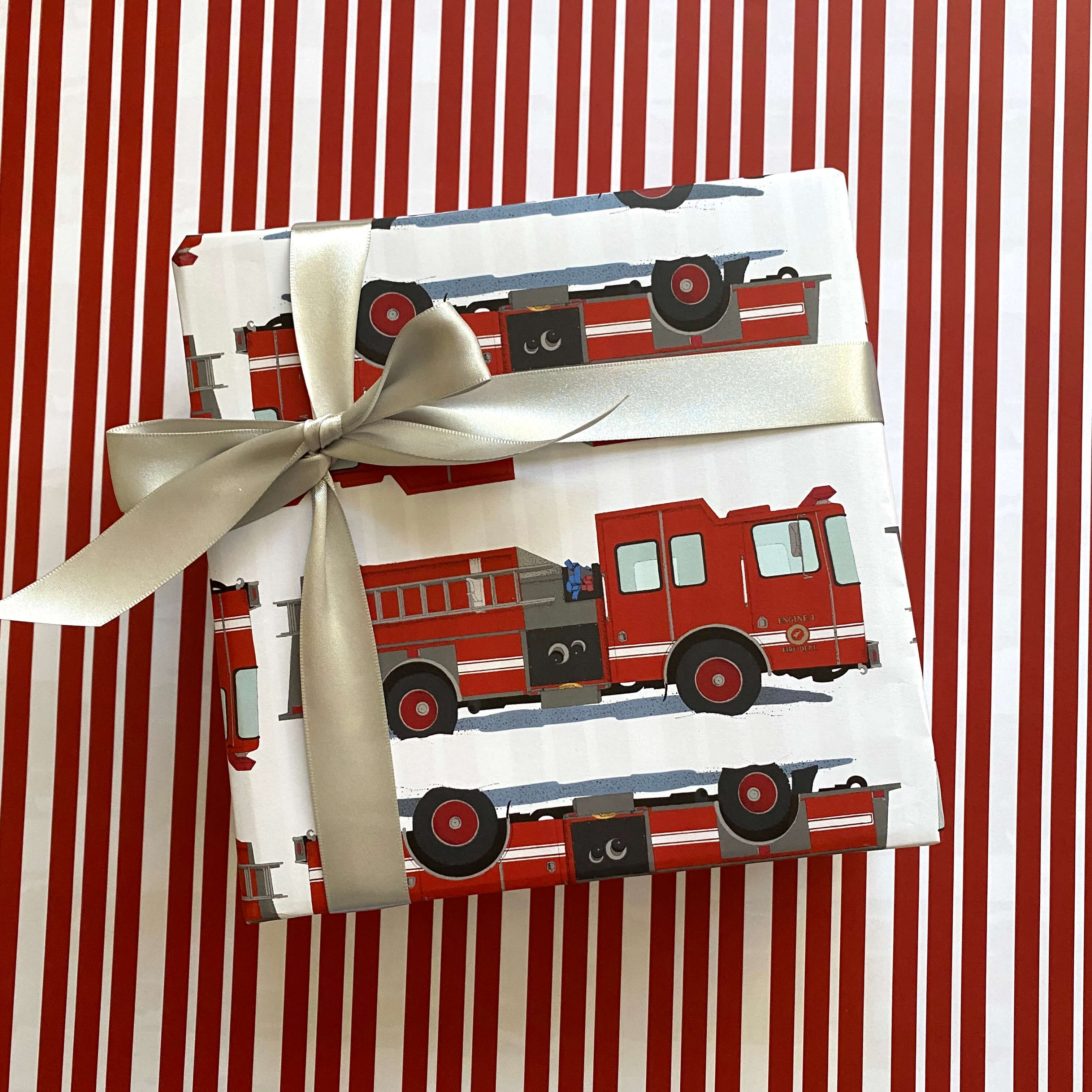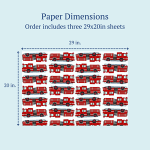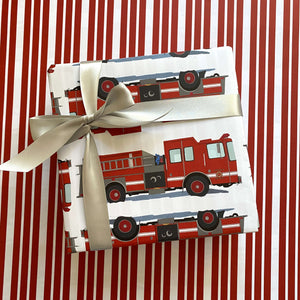 The iconic and cheerful design of our Fire Truck Wrapping Paper makes it the perfect choice for anyone that admires firefighters, or loves vehicles. This luxury double-sided wrapping paper features a classic fire truck pattern. The opposite side features a bright red-and-white-stripped pattern.