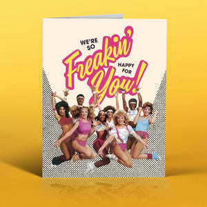 Get ready to bust out your leg warmers and do a happy dance because this card is serving all the 80's vibes! Featuring a crew of retro fitness fanatics in their neon best, this "We're So Freakin' Happy for You!" card is the ultimate way to celebrate someone's big win. Whether they're crushing life goals or just got some epic news, this card brings the fun with a wink and a smile.
