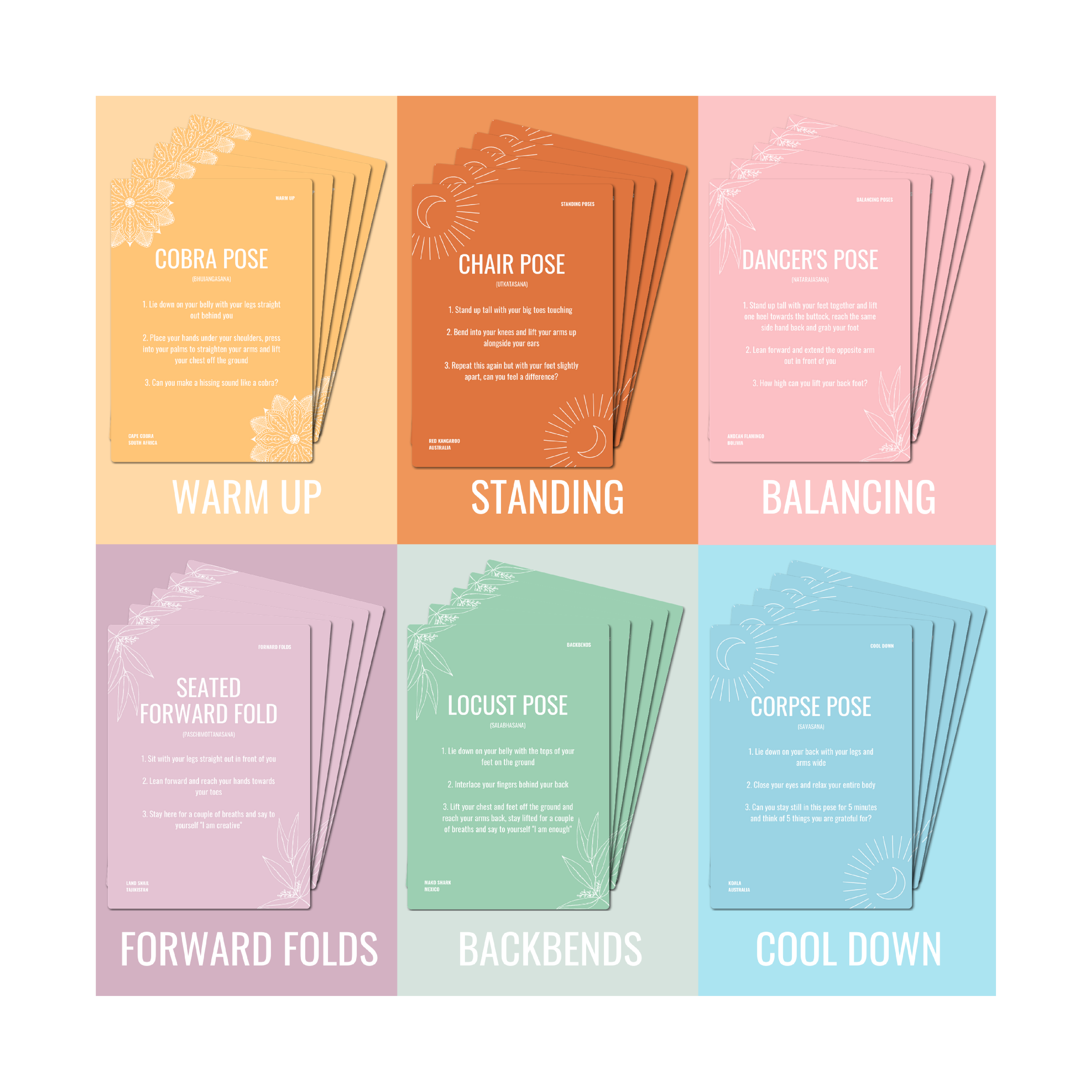 he IMYOGI deck contain 30 cards, split into 6 colour-coordinated categories that will take you through a well-rounded yoga practice, from warm-up to cool-down.