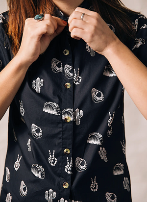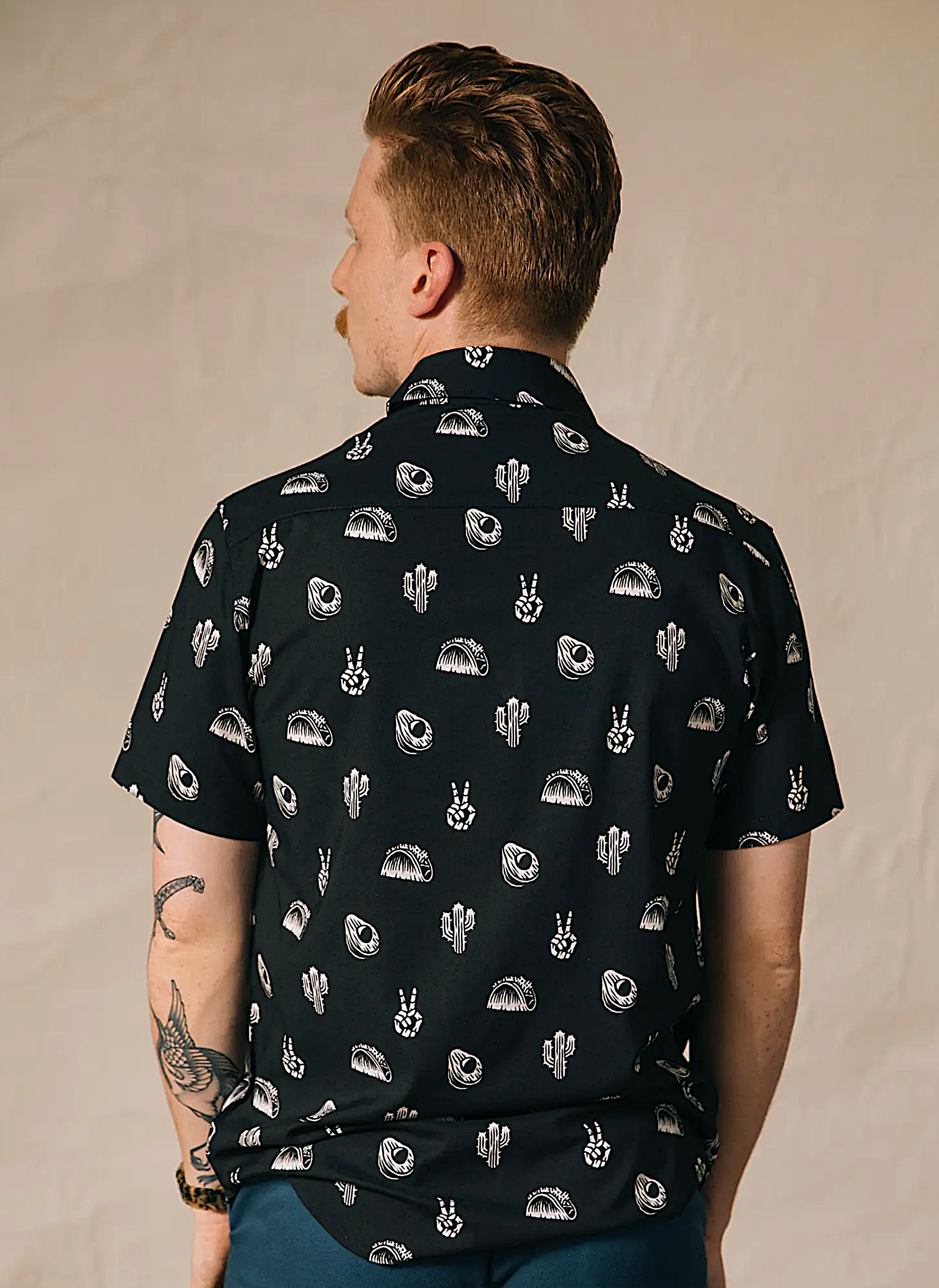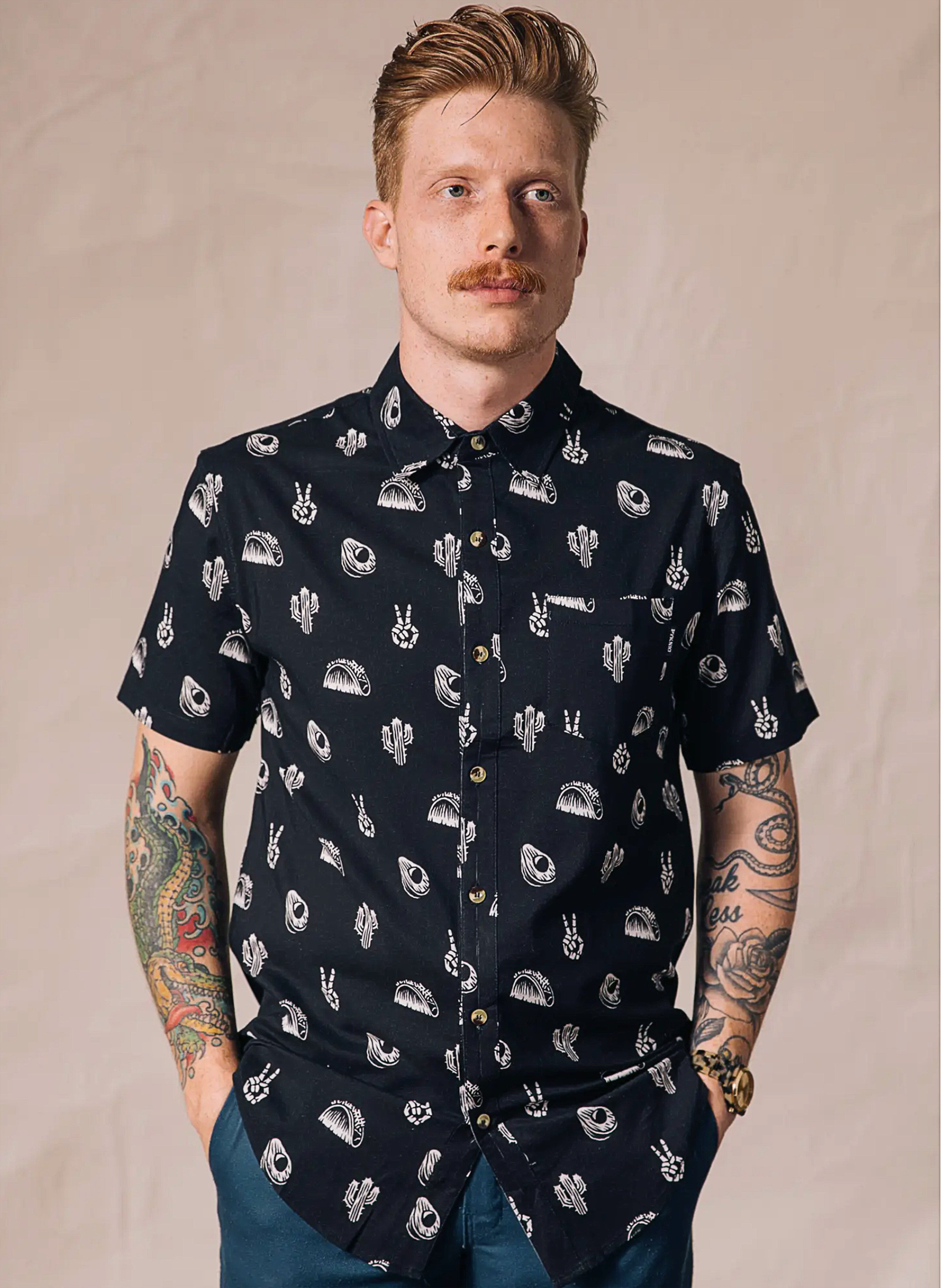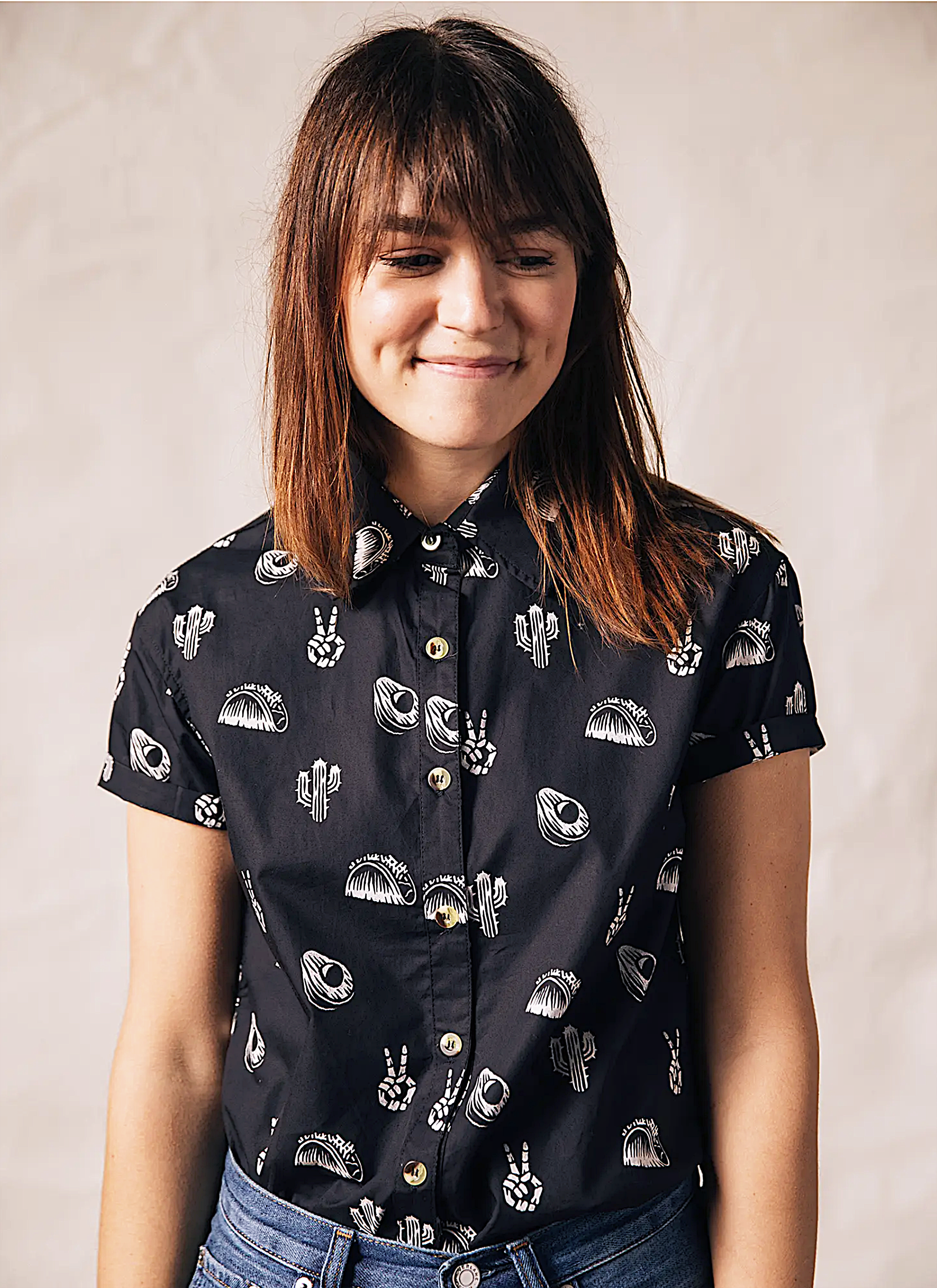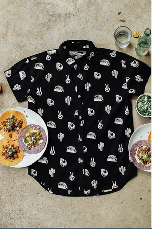 The No Problemo is a fun cut-n-sew button-up shirt. It is made of poplin fabric and has tortoise buttons. The casual shirt features a bold all-over print of tacos, cactus, peace signs, and avocados. Stay sophisticated while not-so-subtly letting everyone know you attend Taco Tuesdays at your local taqueria religiously.