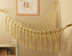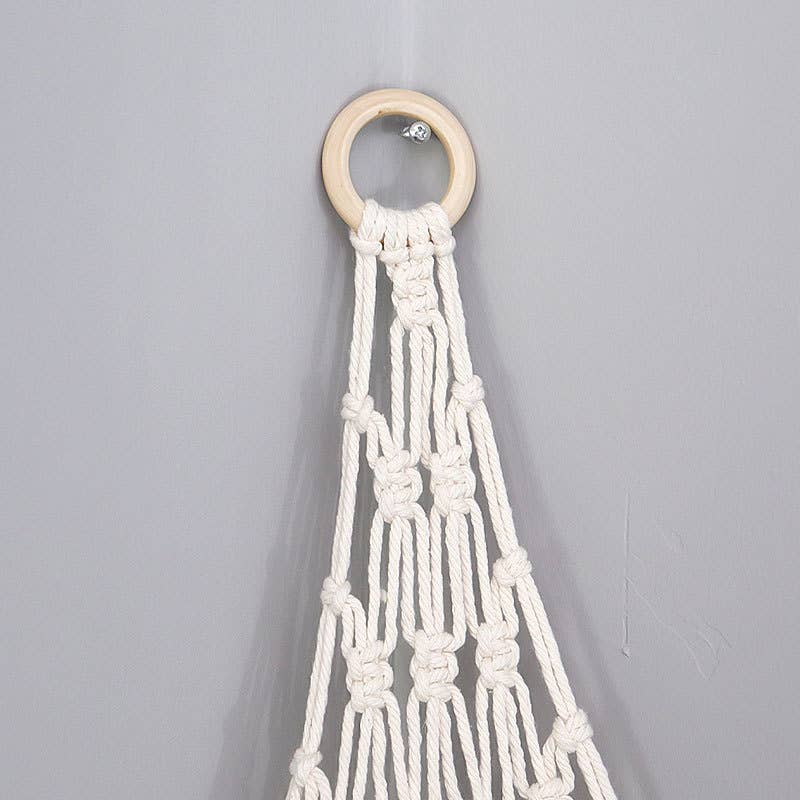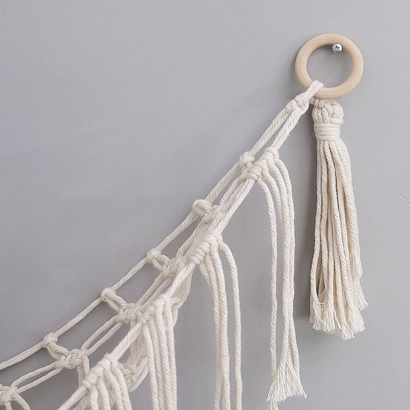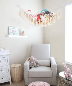 Why hide away kids' adorable stuffed animals when you can display them! It's all in the cute details- fringe finishing with natural wooden beads adds a perfect pop and a bohemian vibe to the unused corners of the room. The Macrame Toy Net for stuffed animals as a fun decor accent Animal Toys Storage Loop for hanging Natural cotton color 100% cotton. For beautiful home decor that gives your home that polish and sparkle.