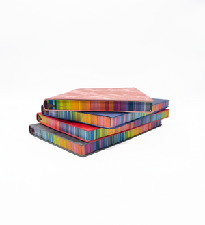 This colorful leather-bound book is a true feast for the eyes. The cover is made of vibrant shades of red, grey, pink, and blue. The book's pages have a rainbow-colored edge, creating a stunning effect that catches the eye. Inside, the pages are smooth and cream-colored, providing the perfect canvas for writing. Whether used as a journal or special keepsake, this book is sure to delight anyone who loves beautiful and unique stationery.