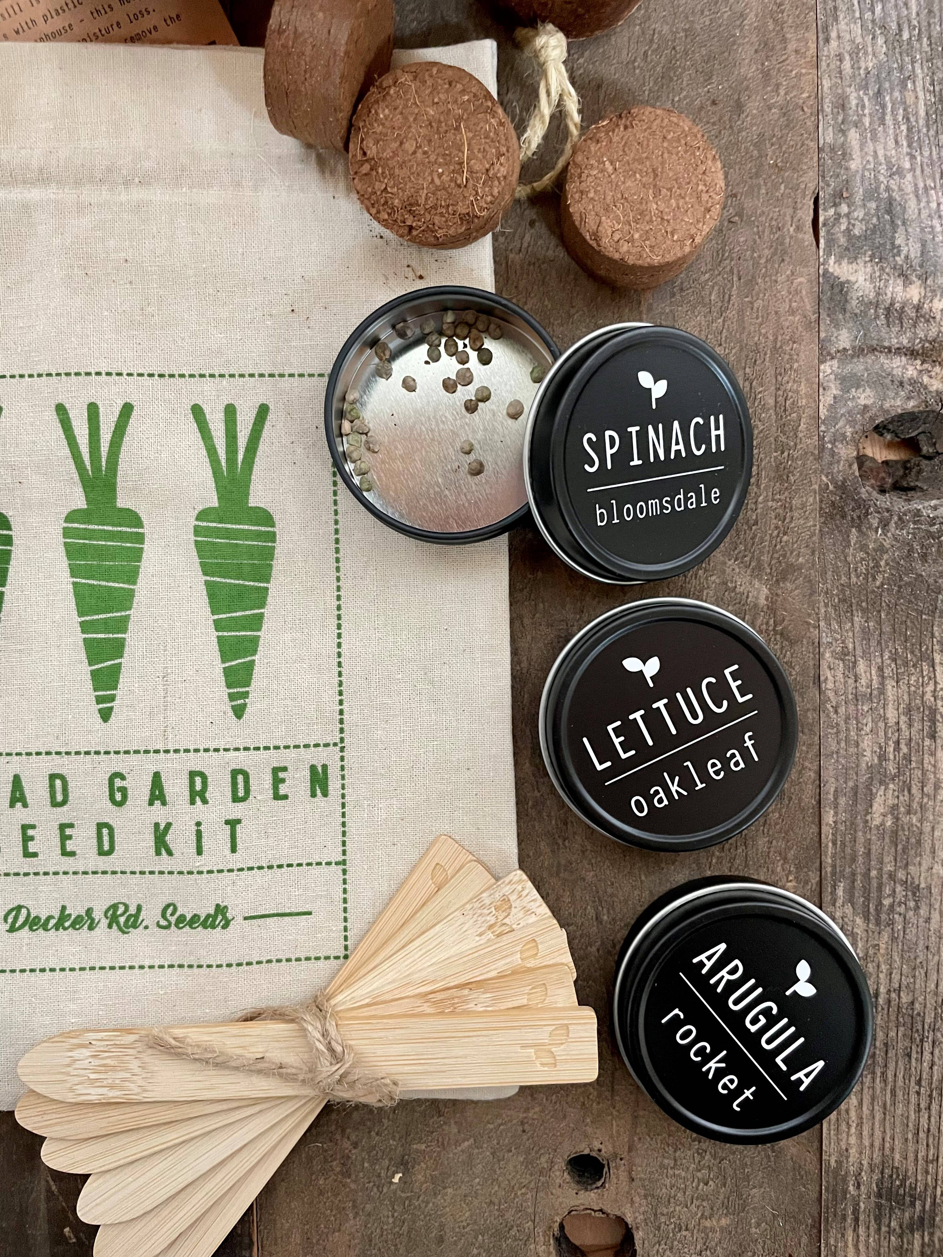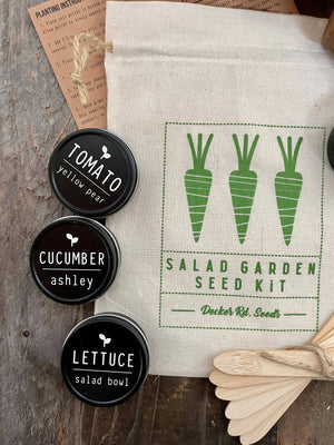Kit includes: 6 coco fiber pots, 6 soil pellets, 6 wooden plant markers, 6 seed tins filled with seeds to grow a tasty green salad instructions packaged in cotton muslin bag with drawstrings (approx. 7x9") Seed varieties include: Arugula 'Rocket', Spinach 'Bloomsdale', Lettuce 'Oakleaf', Tomato 'Yellow Plum', Lettuce 'Salad Bowl', Cucumber 'Ashley'