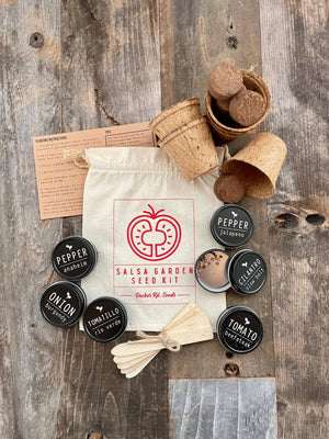 Kit includes: 6 coco fiber pots, 6 soil pellets, 6 wooden plant markers, 6 seed tins filled with the seeds you need to make homemade salsa from scratch planting instructions packaged in stamped cotton muslin bag, with hemp drawstring (approx. 7x9") Varieties include: Tomato 'Beefsteak', Cilantro 'Slow Bolt', Onion 'Red Burgundy', Pepper 'Jalapeno', Pepper 'Anaheim', Tomatillo 'Rio Verde'
