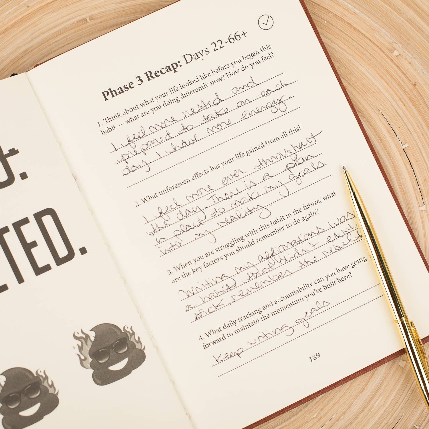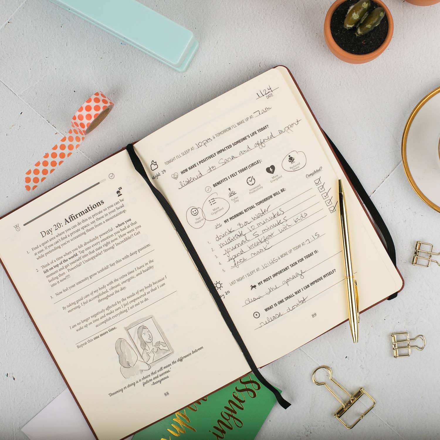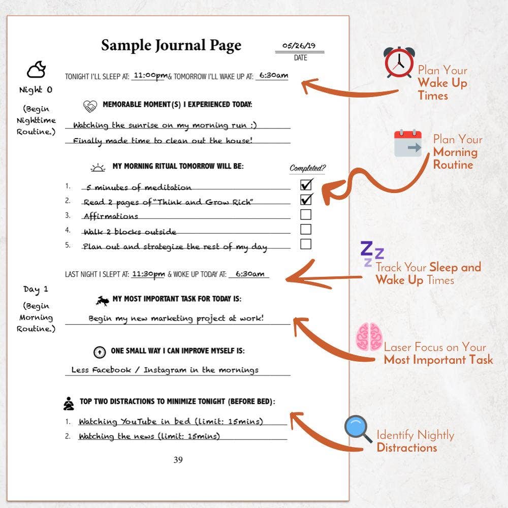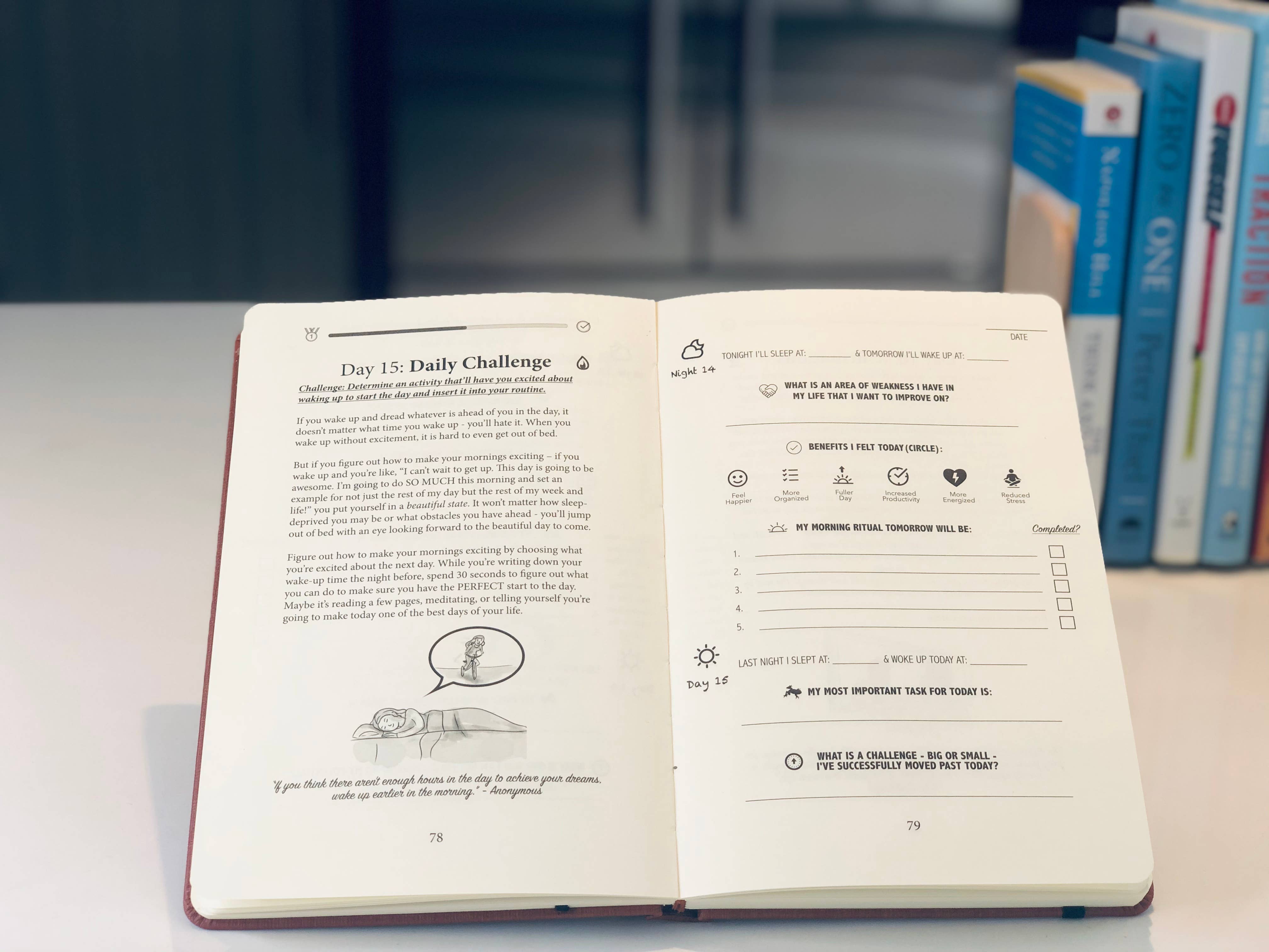The journal is scientifically crafted into a three phase system that provides a unique tracking page. You’ll decide your wake up and sleep times, plan out your mornings the night before so you’re fully ready for the day, track the benefits you’re realizing, and reflect on your days.Each day you're given new learning tools, inspiration, and guidance for improving the quality of your mornings.