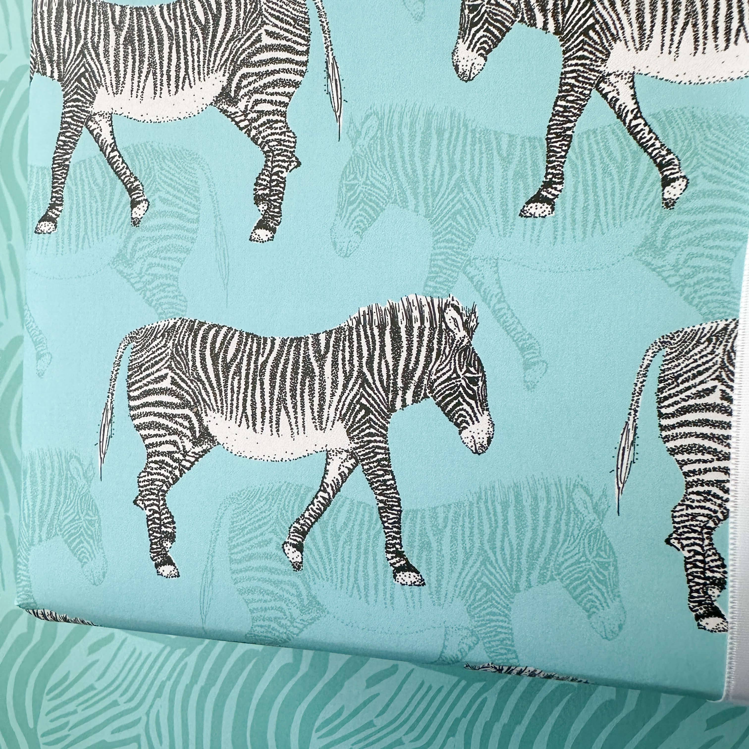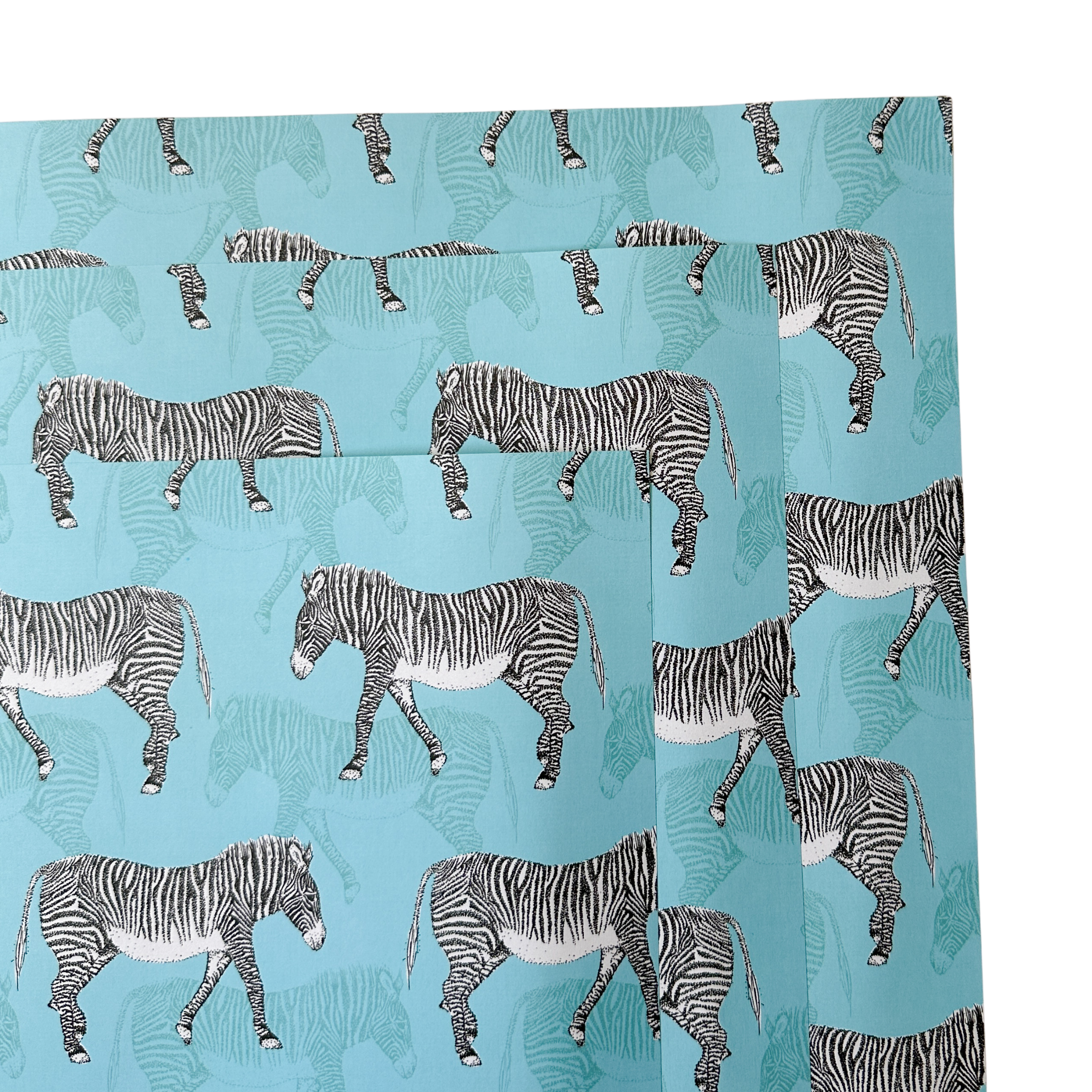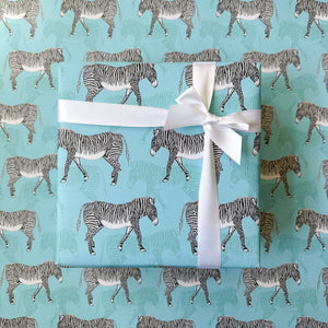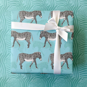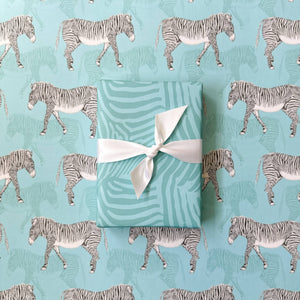 Zebra Wrapping Paper is a celebration of this unique and beautiful animal. Detailed illustrations of zebras march across a deep teal background. This luxury double-sided wrapping paper features black and white zebra marching across a teal background. The opposite side is a zebra skin pattern of deep and light teal.